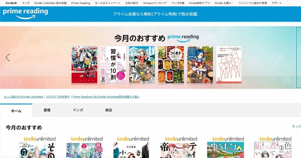 いきなりKindle Unlimitedは抵抗があるはずです。なので Amazon primeの「プライムreading」から始めてみましょう。