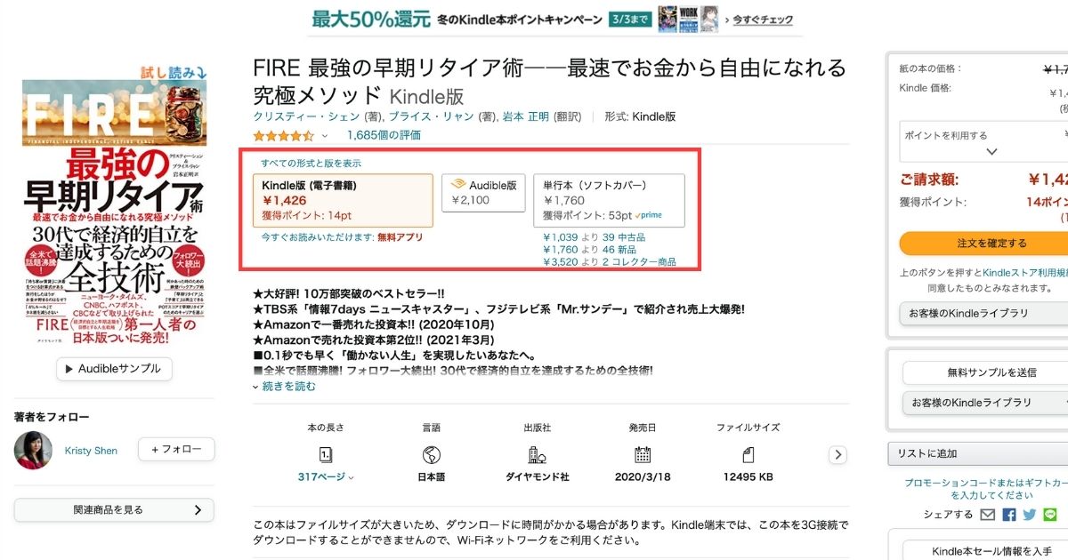 下の画像の場合、Kindle、単行本どちらの価格も1,000円以上します。